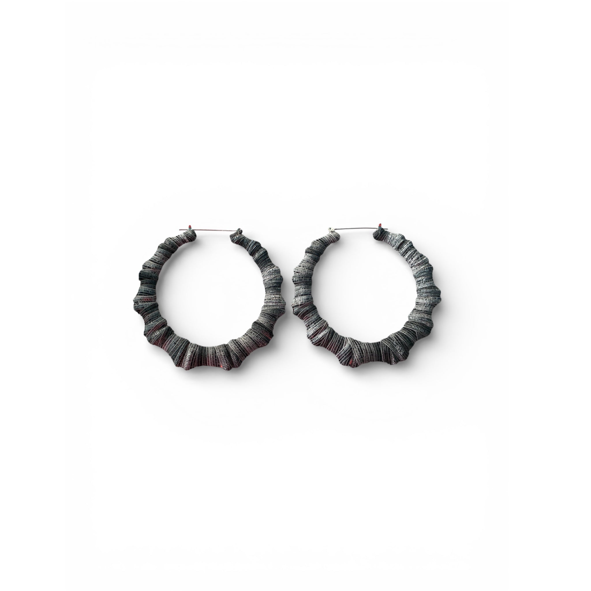 Featuring a striking mix of deep graphite and shimmering silver-toned threads, these hoops offer a metallic luster without the heavy weight of solid metal. The grayscale palette creates a versatile, high-contrast look that bridges the gap between urban streetwear and artisan jewelry.